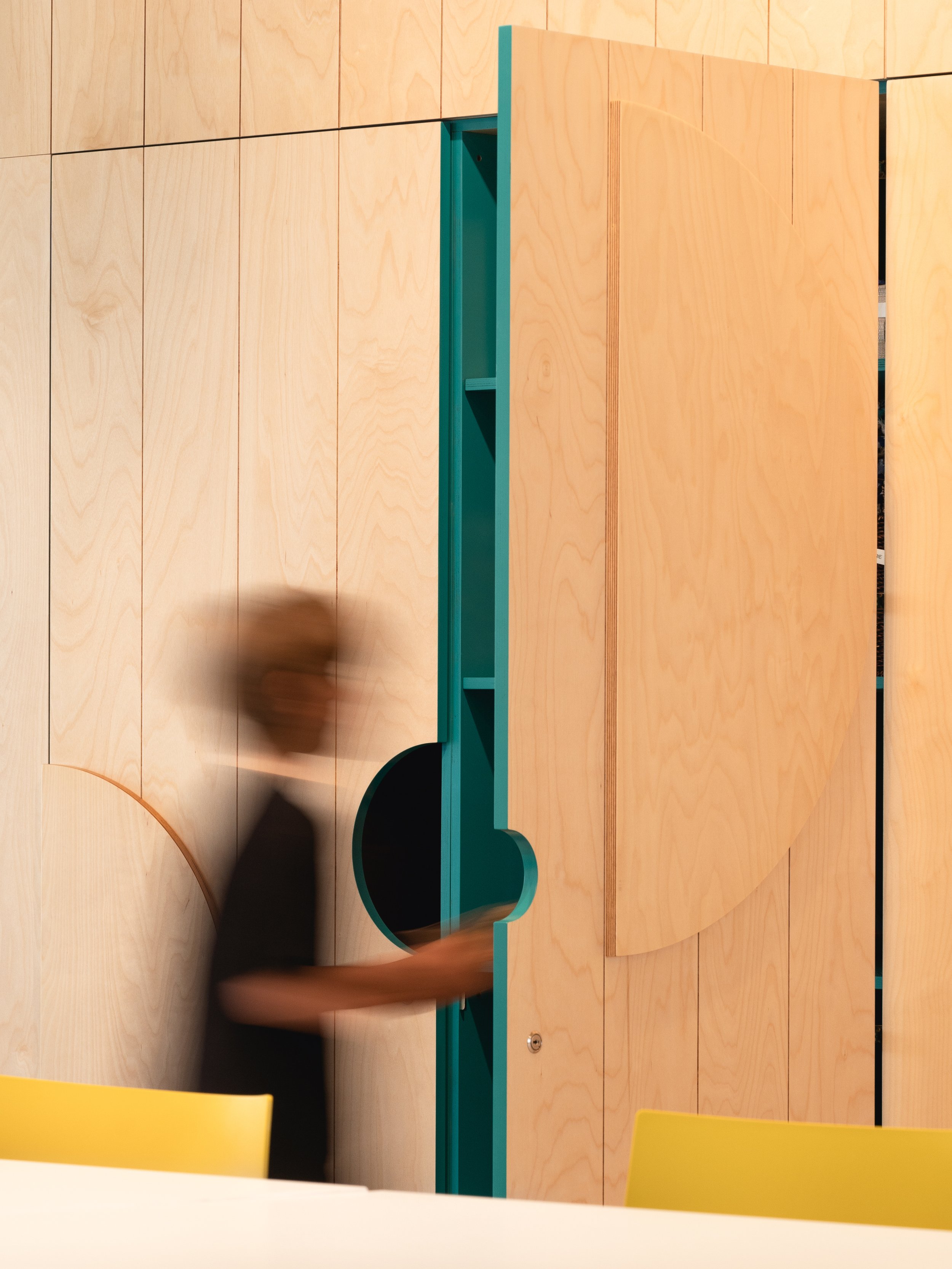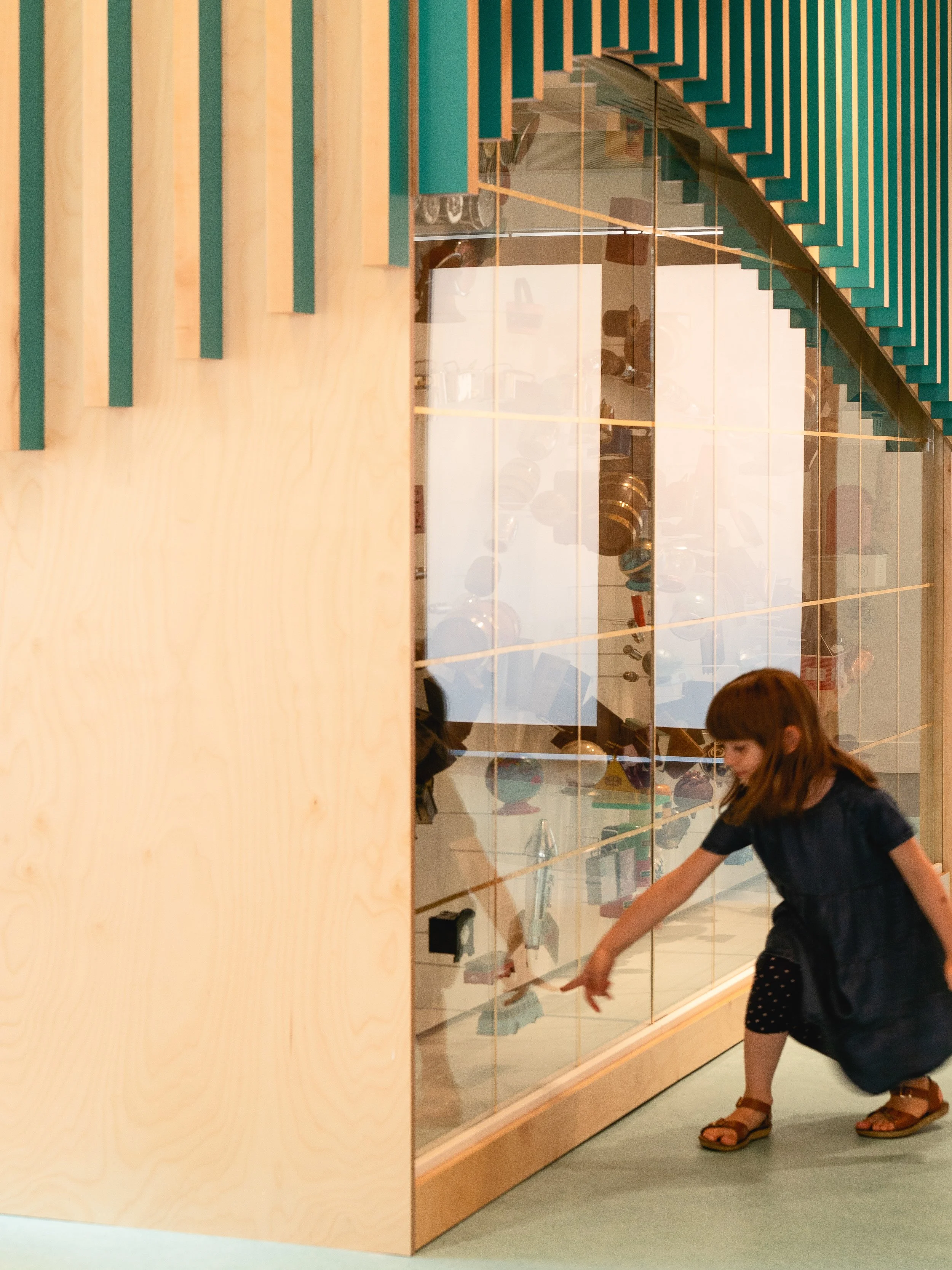 Le mobilier sur mesure, à la fois ludique et fonctionnel, utilise des couleurs vives et des matières naturelles claires. Il a été développé en tenant compte des spécificités de chaque activité et des artefacts présentés. Tout a été conçu pour faciliter l’installation et la participation des enfants.Une grande vitrine, suivant la ligne ondulante du plancher, présente des artefacts et des jouets anciens issus des précieuses collections du Musée.